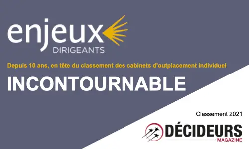 Pour la dixième année consécutive, Enjeux Dirigeants se positionne en tête du classement des cabinets d’outplacement incontournables établi par le guide Décideurs. Nous accompagnons avec passion et engagement les dirigeants pour